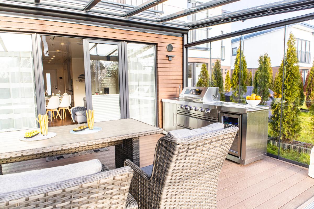 Der absolute „Knaller“ der Ostsee-Villa ist aber der Außenbereich. 500 Quadratmeter Garten und zwei Terrassen laden ein zu Spiel, Spaß oder Entspannung. Während eine Terrasse traditionell offen gestaltet ist, bietet Terrasse Nummer zwei einen Wintergarten. So könnt ihr bei jedem Wetter gemütlich draußen sitzen oder sogar draußen kochen. Denn in den Wintergarten haben wir eine vollständig ausgestattete Außenküche integriert. Deren Herzstück ist ein großer Gasgrill mit vier Brennern und Edelstahlhaube. Komplettiert wird die Außenküche mit einem Edelstahlwaschbecken sowie einem Kühlschrank mit stylischer Innenbeleuchtung. Und wenn das Wetter mal gar nicht mitspielt? Dann zieht Ihr einfach die Glastüren zu und könnt die Terrasse trotzdem prima nutzen. Zu guter Letzt haben wir direkt an der Ostsee-Villa fünf Parkplätze angelegt, auf denen Ihr entweder fünf Autos oder drei Autos plus einen Bootsanhänger bequem abstellen könnt.